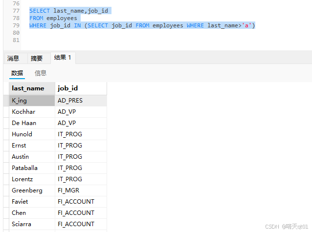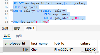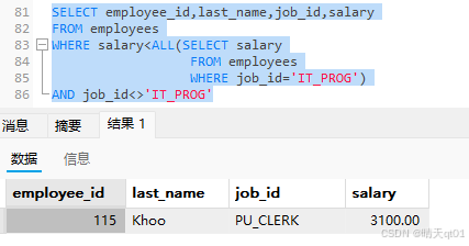 这里的值就少了很多,因为用的是all函数,所以结果必须比全部部门是’it_prog’部门工资低,所以最后的结果是小于最小值才行,条件上all是比较苛刻的,