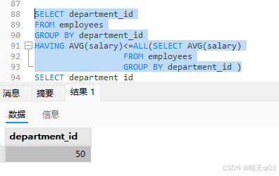 我们想想能不能用any和all解决,我们这个部门的工资现在是不是要比每一个部门的工资都要小,但是和最后一个是相等的,那么我们就可以用<=里面的每一个值.:这是方法1: