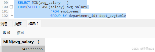 group by department_id这个是不是代表了一个表,那么我们希望从这个表里提取出这行的最小值,自然而然的我们直接from这张表,并用min函数,我们试一试