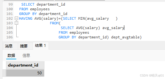 所以这里我们也用了一个子查询,还是比较有意思的,接下来我们要查那个部门的工资等于这个值