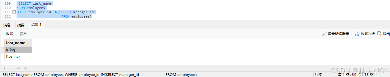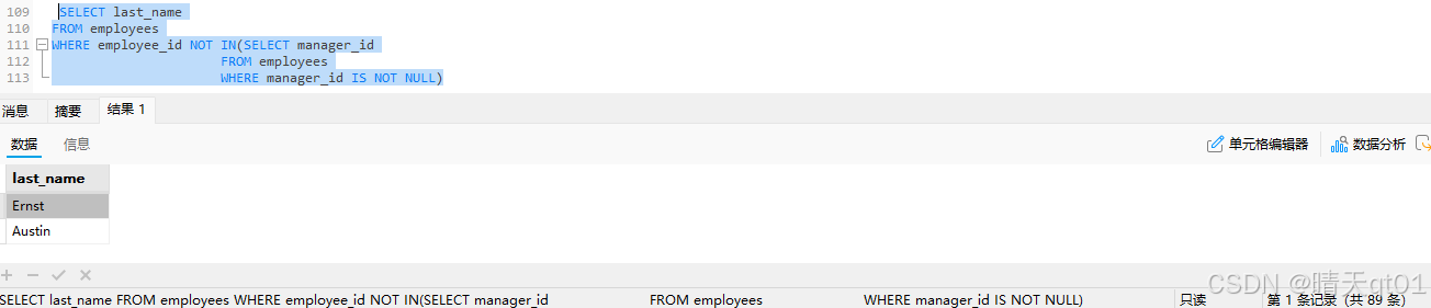 现在一共查出来18条,那么我们还有一个疑惑,可不可以查出来剩下不是管理者的员工呢,我们把in改成not in