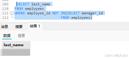 发现结果是空表,不是我们期望的结果,这里不能简单的加个not,这是为什么呢,因为我们的结果里包含了null