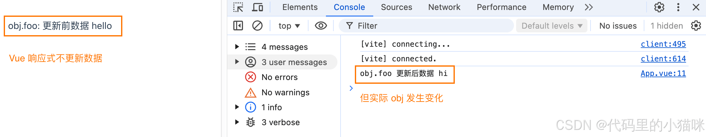 console.log('obj.foo', obj.foo) // "更新后数据 hi"(原始对象和响应式对象指向同一内存地址)