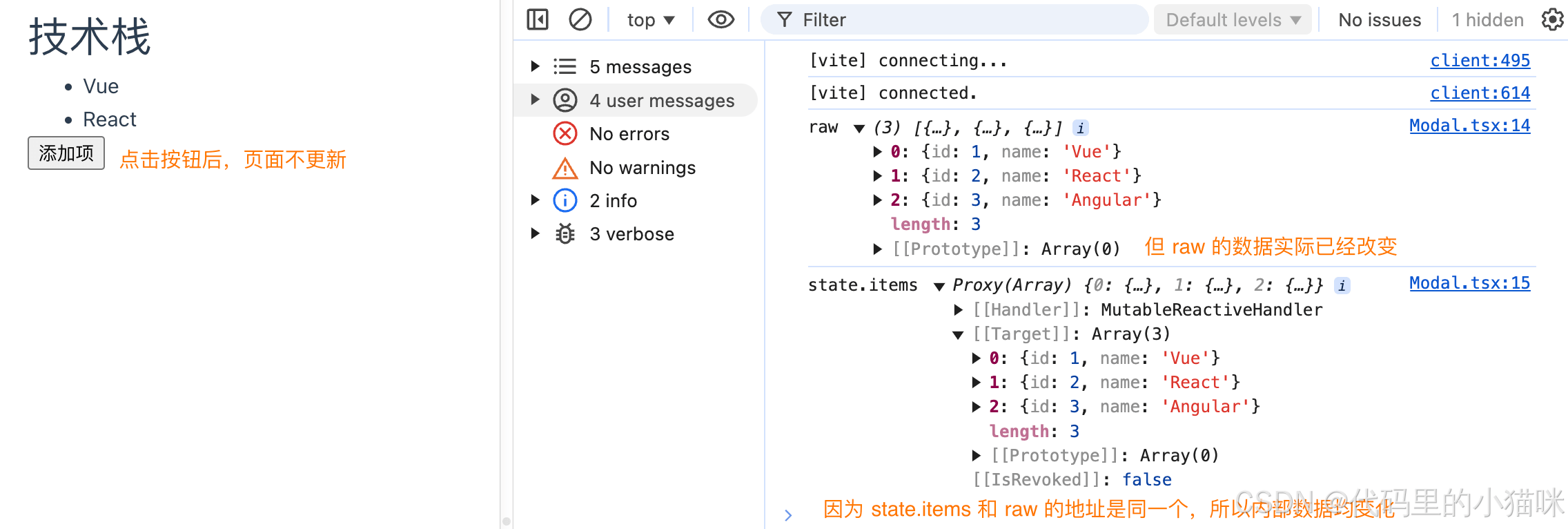 2、📢:注意原始对象的修改不会触发视图更新。