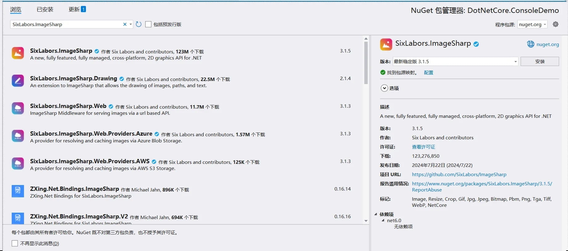 首先需要将其添加到自己的项目中。通过nuget包管理器安装是最简单的方式,具体如下所示: