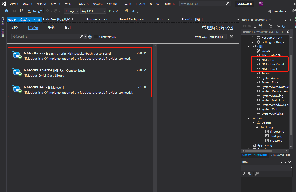 本文实现需要借用一个开源的nmodbus库来完成,通过在菜单栏,工具-----nuget包管理器-----管理解决方案的nuget程序包,安装nmodbus的开源库。