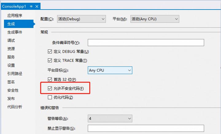 2、在c#中使用指针,需要启用“允许不安全代码”设置