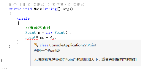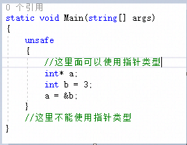 只有在unsafe所包含的代码区块中,才能使用指针。类似lock关键字的语法结构