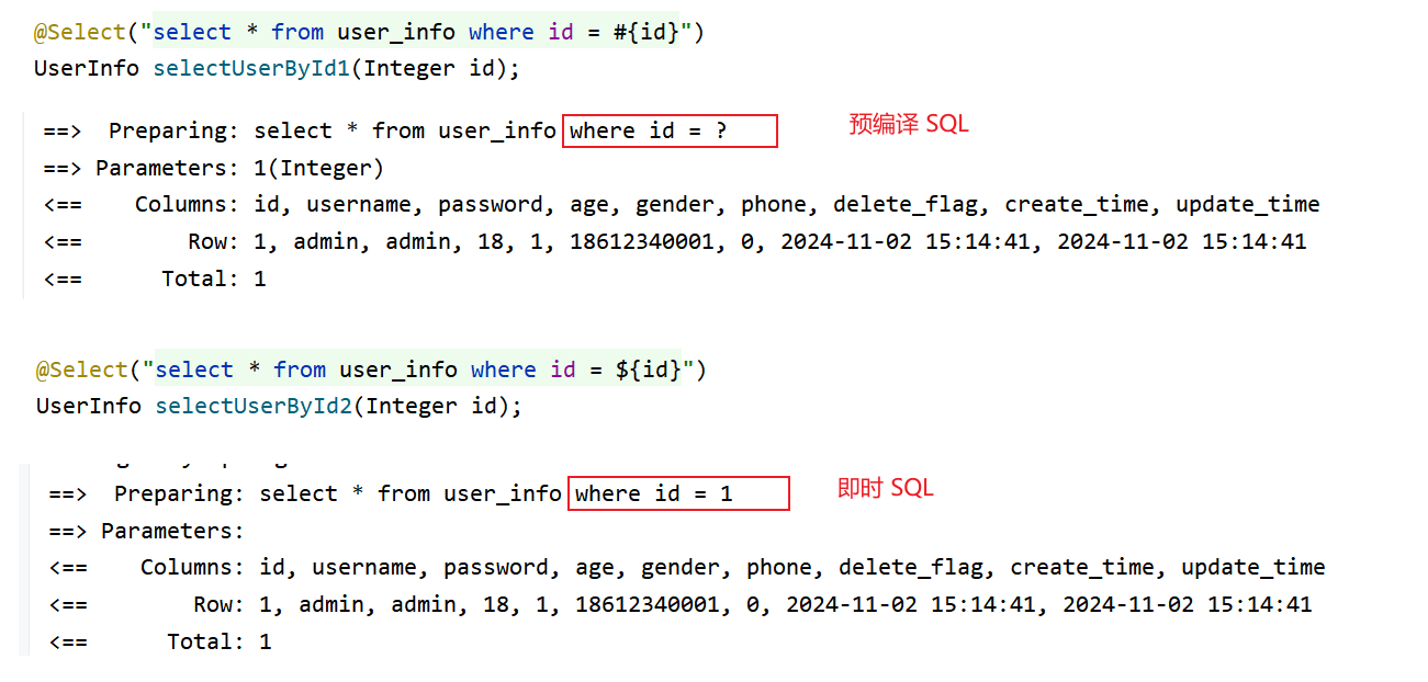 #{} 的 sql 语句中的参数是用过 ? 来起到类似于占位符的作用,而 ${} 是直接进行参数替换,这种直接替换的即时 sql 就可能会出现一个问题