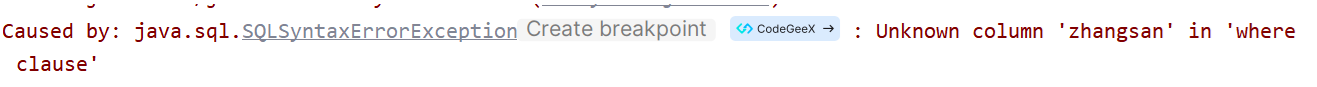然后发现又报错了,因为使用的是 #{} ,所以就会替换为 '%'zhang'%',这样是肯定不能运行的,所以还是需要使用 ${} 进行直接替换,但是这时怎么去解决 sql 注入的问题呢,这样就不能简单的通过枚举或者判断来约束传入的参数了,这时就可以通过使用拼接的方式