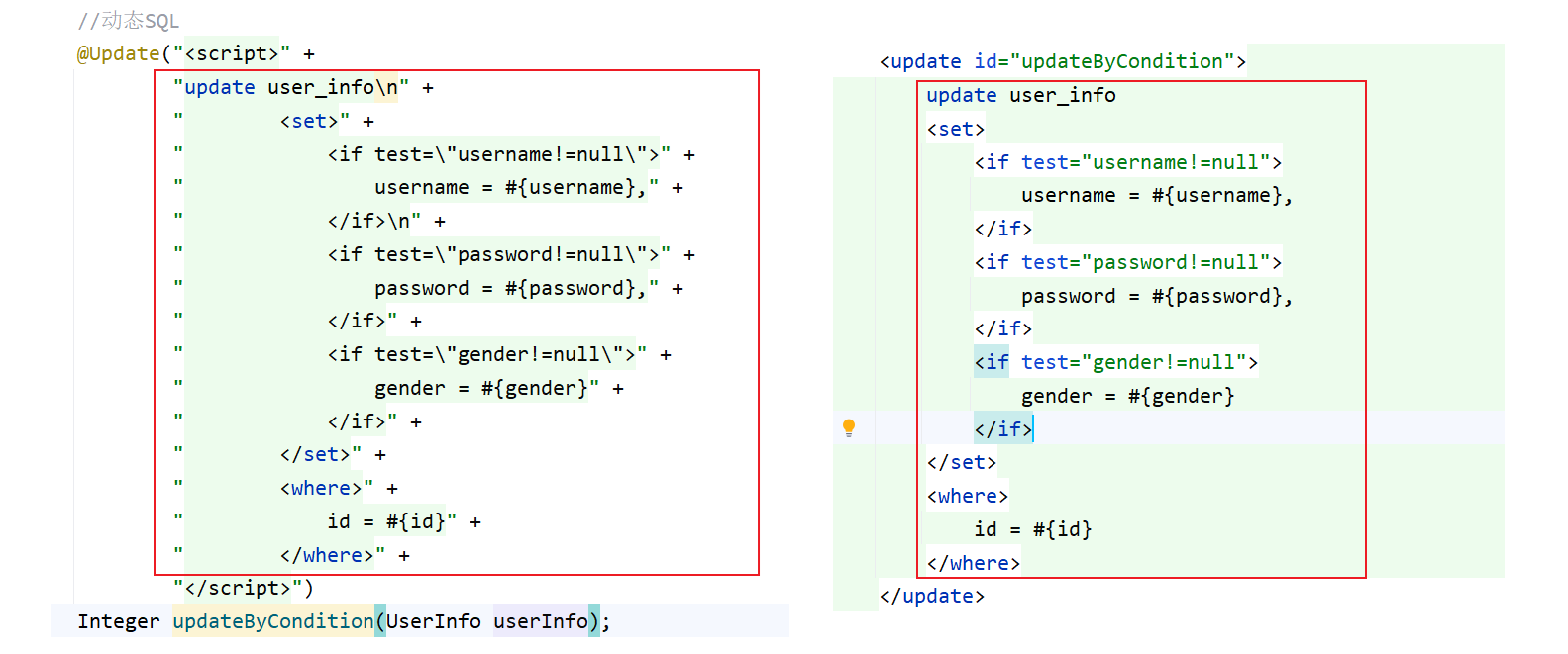 注解方式就是把原来 xml 中的 sql 语句部分写到注解的 <script> 标签下,可以看出,由于注解中是字符串拼接的方式,这种方法是非常容易出错的,而且排查错误也是有些困难的