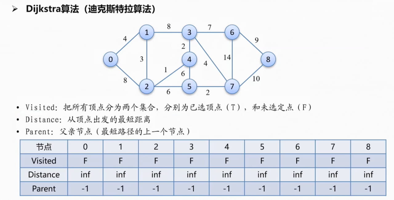 - 源节点到自身的距离设为0,其他节点的距离设为无穷大