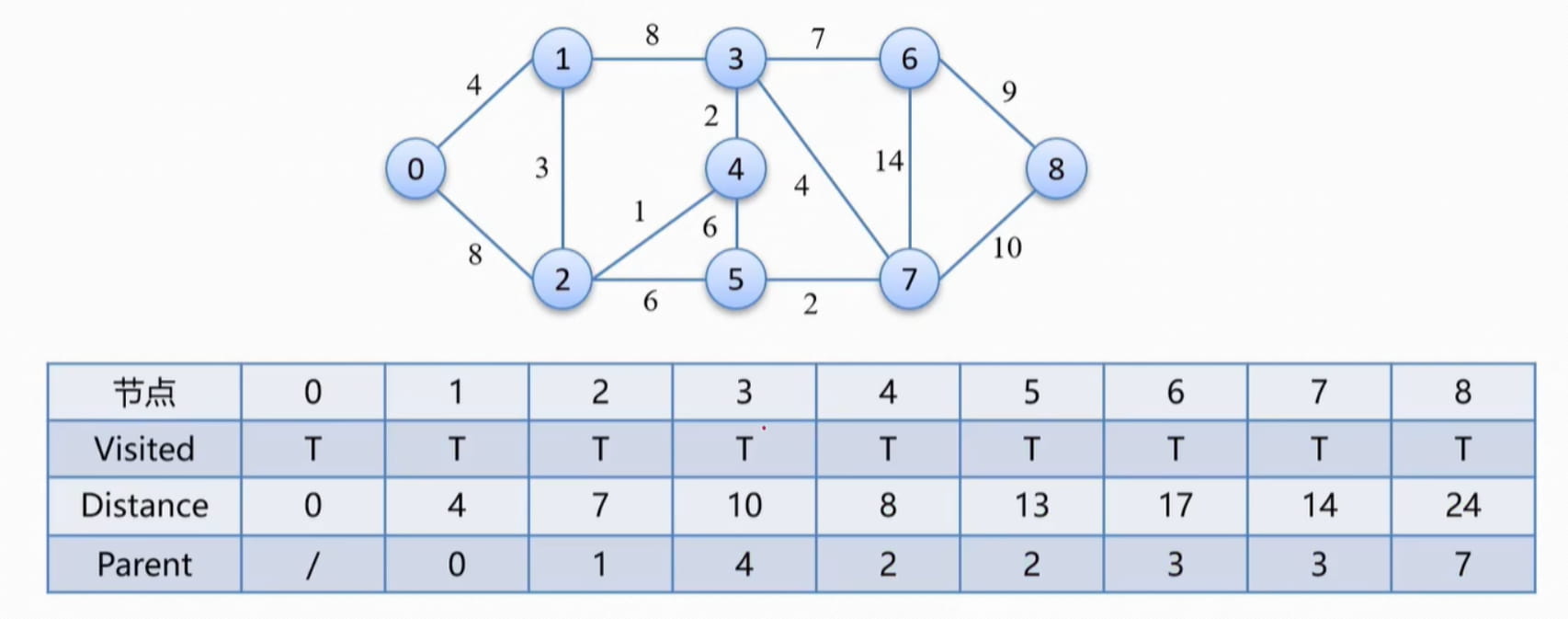 要求从 0 到 8 的最短距离,就从 8 开始回溯,8 的父亲节点是 7 ,7 的父亲节点是 3 ,3 的父亲节点是 4 ,4 的父亲节点是 2 ,2 的父亲节点是 1 ,1 的父亲节点是 0 ;所以从 0 到 8 的最短路径为: 0 —> 1 —> 2 —> 4 —> 3 —> 7 —> 8