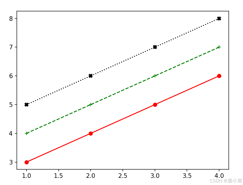 import matplotlib.pyplot as plt import numpy as np x=np.array([1,2,3,4]) y=np.array([3,4,5,6]) plt.plot(x,y,'-or') plt.plot(x,y+1,'--+g') plt.plot(x,y+2,':xk') plt.show()