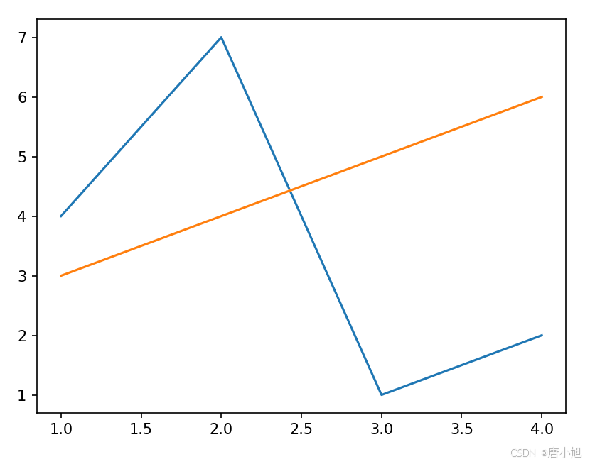 import matplotlib.pyplot as plt import numpy as np x1=np.array([1,2,3,4]) x2=np.array([1,2,3,4]) y1=np.array([4,7,1,2]) y2=np.array([3,4,5,6]) plt.plot(x1,y1,x2,y2) plt.show()