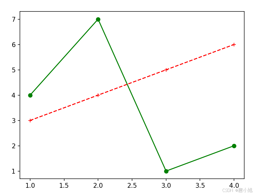 import matplotlib.pyplot as plt import numpy as np x1=np.array([1,2,3,4]) x2=np.array([1,2,3,4]) y1=np.array([4,7,1,2]) y2=np.array([3,4,5,6]) plt.plot(x1,y1,'-og',x2,y2,'--+r') plt.show()