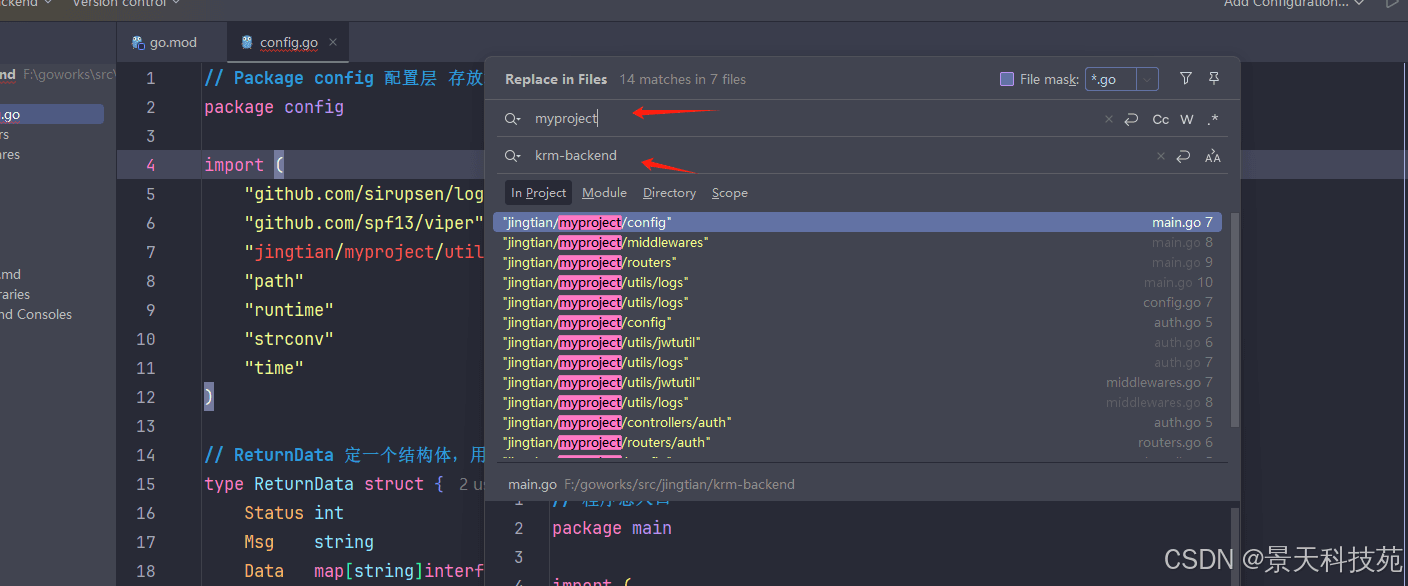 在goland ide中想要替换某一段特定的字符串,可以使用find and replace 功能来实现。这是一种全局性的操作,将会在你的整个项目或指定的文件/文件夹中进行。