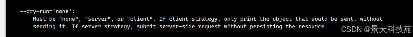 –dry-run 选项只能为 “none”、“server”、"client"三者中的一个,默认是none;当不加该参数,或者为none的时候,该操作后资源会生效 ,请求会被发送到kube-apiserver并做实际更改;