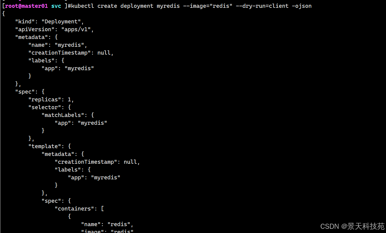 kubectl create deployment myredis --image="redis" --dry-run=client -ojson