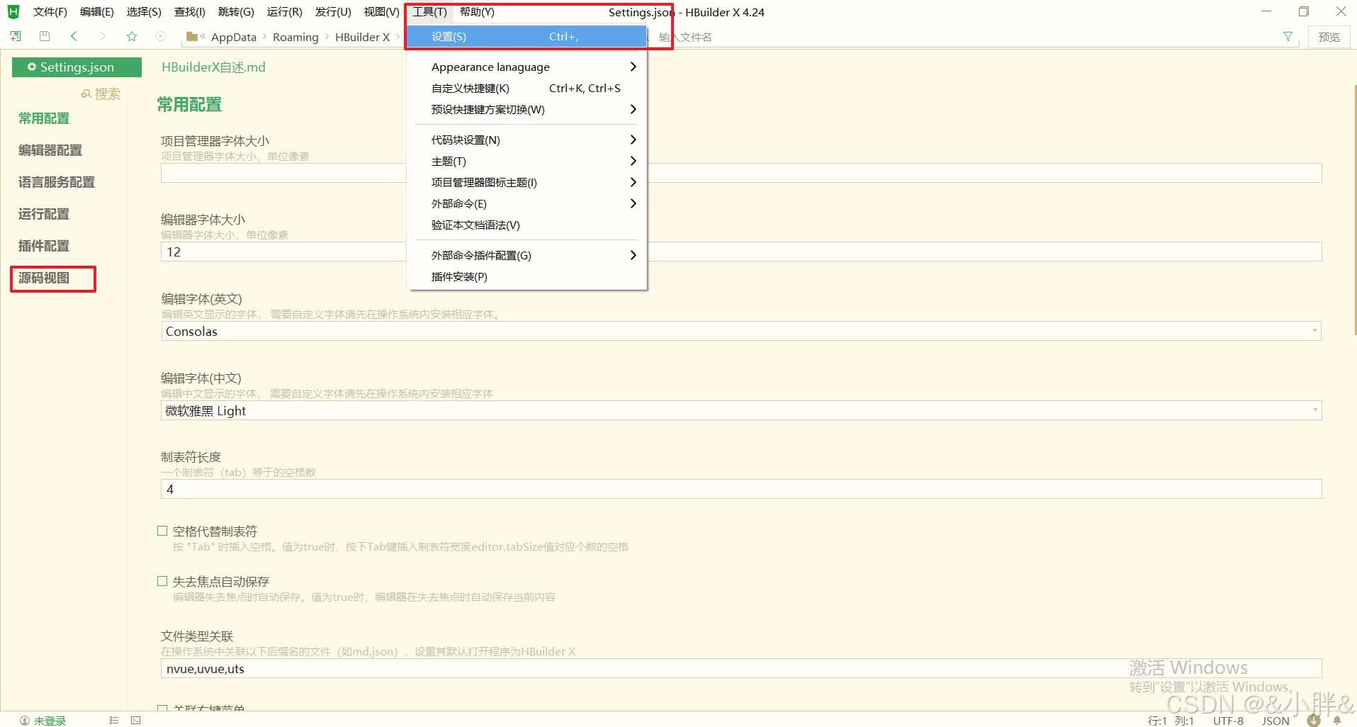 操作步骤:工具->设置 ,点击源码视图