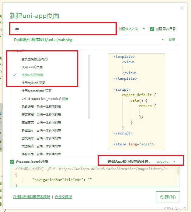 4.配置页面后会在pages.json中subpackages.pages中自动填写创建的页面信息3.4.3新建分包文件
