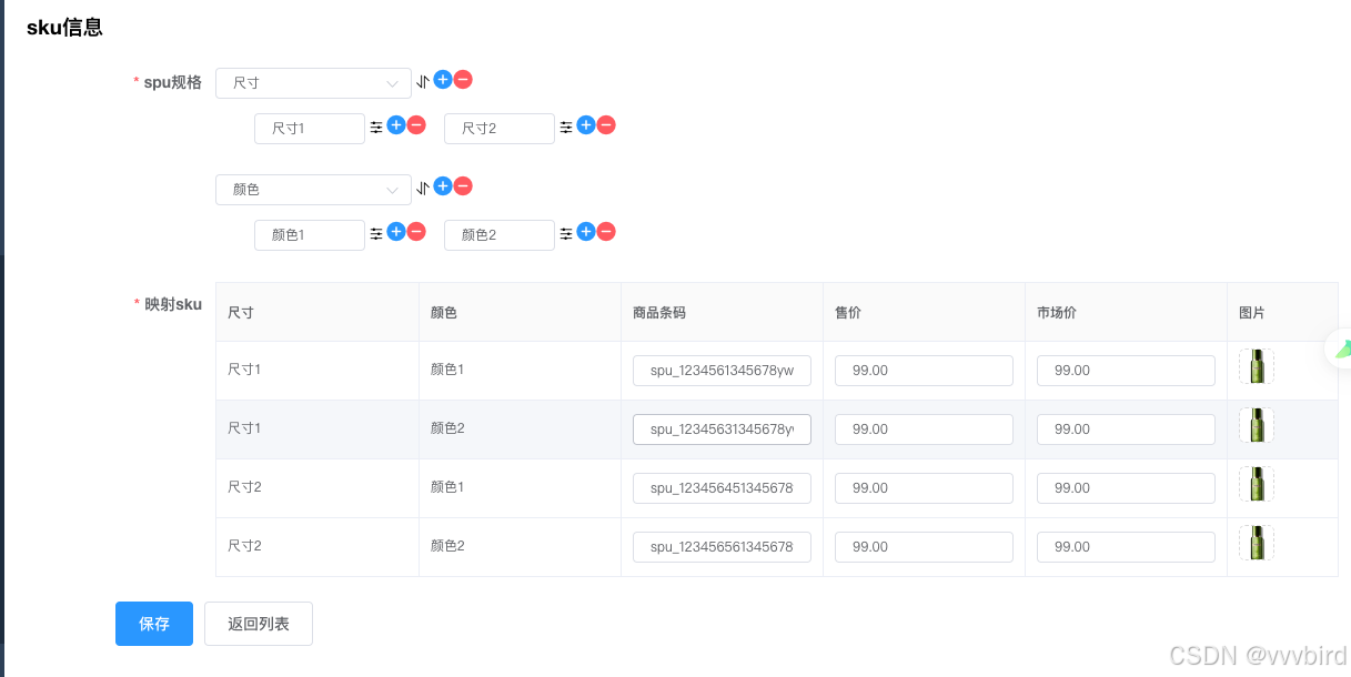场景:后台页面根据商品规格和规格值,动态(增删改查)在表格中生成对应的sku. 如图: