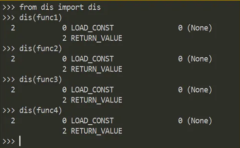 在这个对比图中,可以看出上述 4 个函数的解释器指令一模一样!