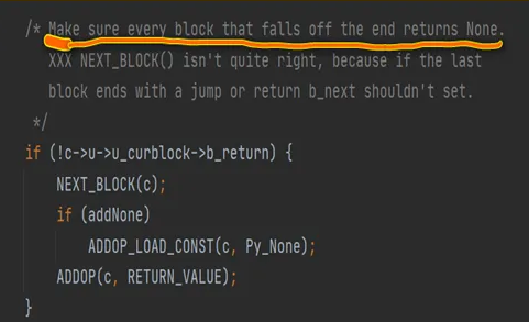答案就在解释器中,当 cpython 解释器执行到函数的最后一个代码块时,若发现没有返回值,它就会主动地加上一个 py_none 值返回: