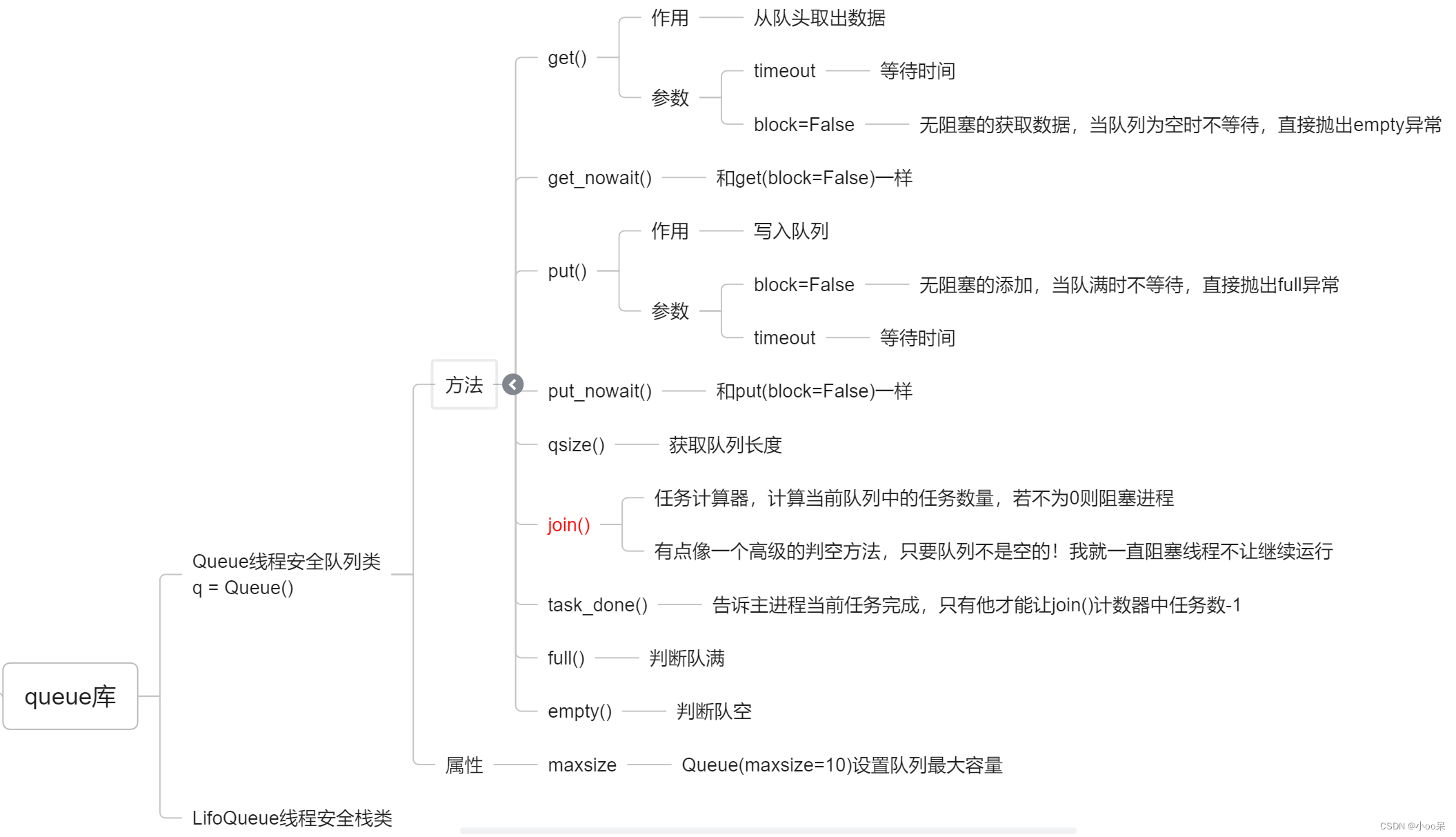 # 创建一个queue对象,可以理解为初始化一个队列,参数maxsize默认为0,表示队列大小无限制
