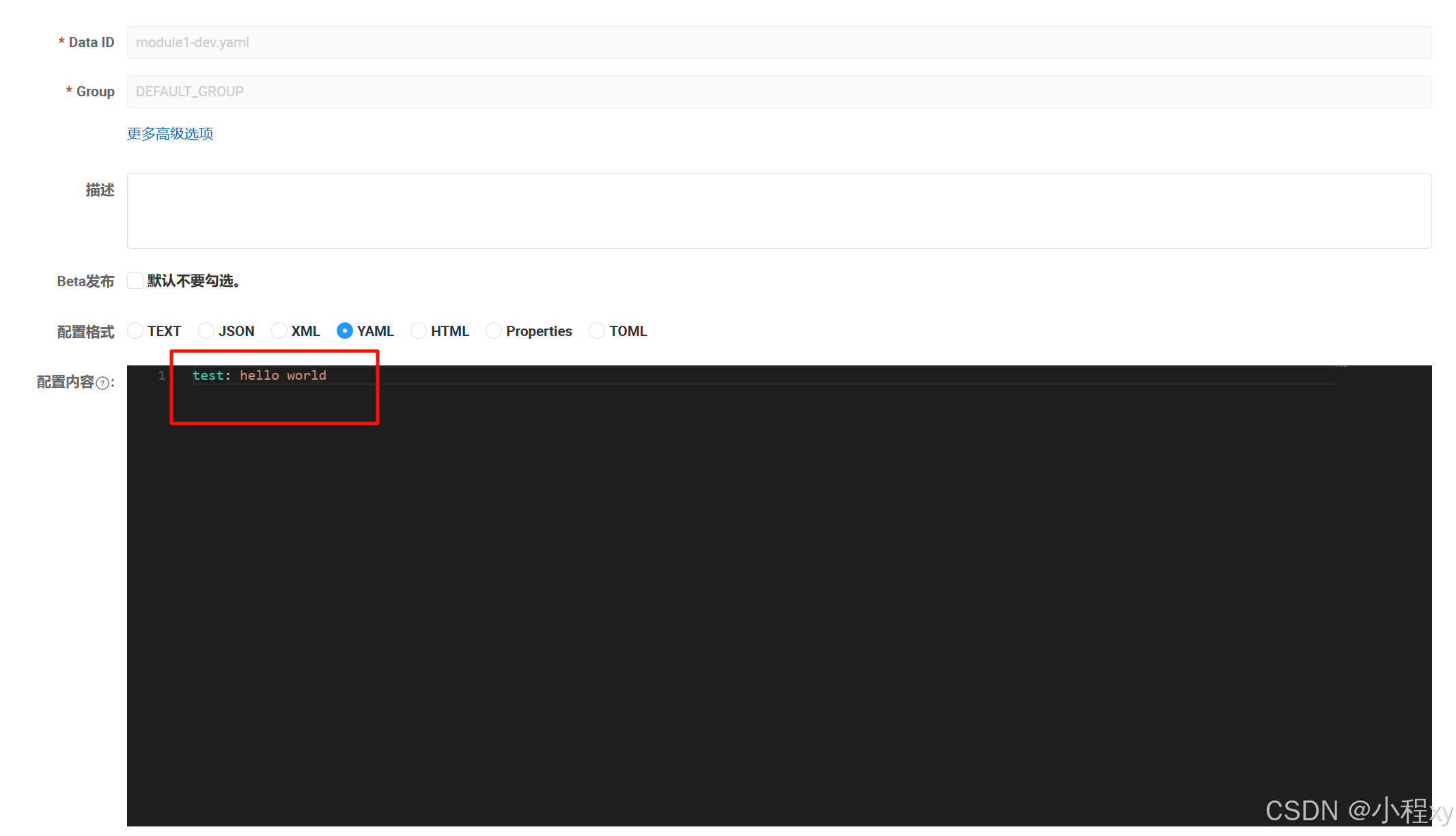 file-extension: yamldata_id 一般命名采用 application.name-profiles.active.filex-extension,根据上面的配置,我的dataid就是 module1-dev.yaml