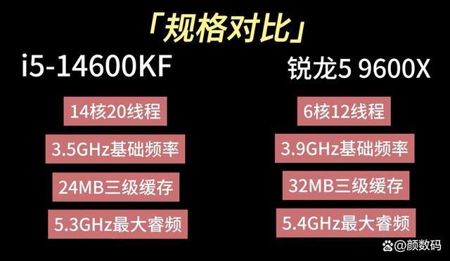 在频率上,基础频率与最大睿频,锐龙5 9600x稍领先于i5-14600kf,吃单核的应用与游戏中,两者可能打得有来有回。同样游戏看中的三级缓存大小,也是锐龙5 9600x要大些。