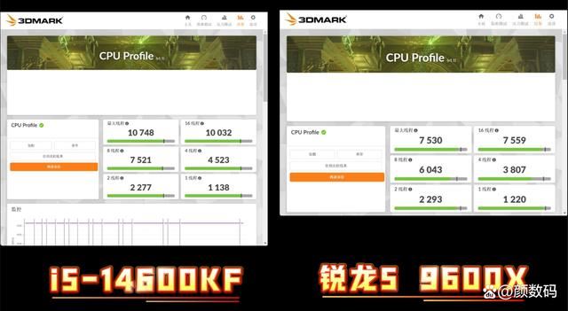 在3dmark cpu profile测试中,i5-14600kf最小线程得分1138分,稍稍落后锐龙5 9600x。但是多线程下,i5-14600kf无敌了,比如最大线程,10748分对7530分,领先超42%。