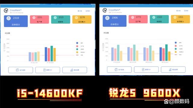 在crossmark测试中,i5-14600kf总得分2310分,锐龙5 9600x总得分1906分,不管是生产率,创造性,还是反应能力测试中,都占据优势。