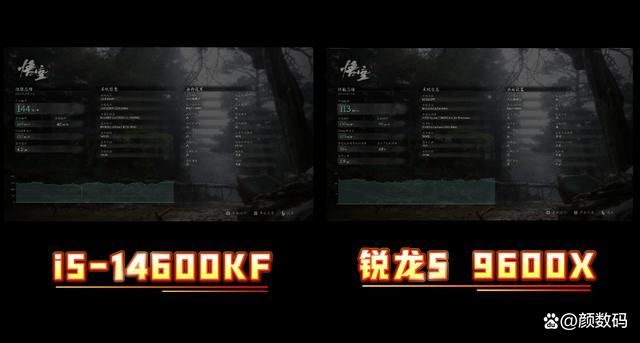 在《黑神话:悟空》测试中,i5-14600kf的平均帧跑到144帧,而锐龙5 9600x只跑到113帧,i5-14600kf保持优势。