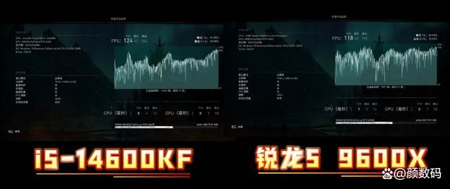 在《刺客信条:英灵殿》测试中,i5-14600kf的平均帧跑到124帧,而锐龙5 9600x只跑到118帧,同样是i5-14600kf胜出。