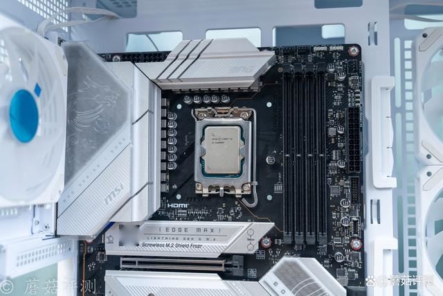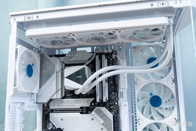 散热用的是微星的mag coreliquid i360 white寒冰,这款水冷的颜值很漂亮,水冷头采用双面无限镜设计。细节方面的表现也非常不错,水冷排的冷排风扇侧面还设计有装饰盖,可以直接盖在冷排风扇的侧面,把侧面的线材盖住。