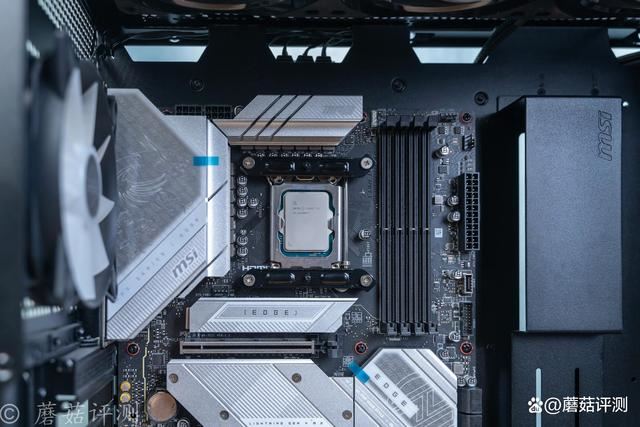 主板用的是微星的mpg b760m edge ti wifi刀锋钛,这块主板用料十分豪华,供电采用12+1+1相的规格,其中核心供电12相,清一色的75a的drmos,非常给力。另外在主板供电电路上面,还覆盖有大体积的金属散热片,并在左侧金属散热片的上面,还有一块饰板,中间是微星的龙标logo,支持argb灯效。