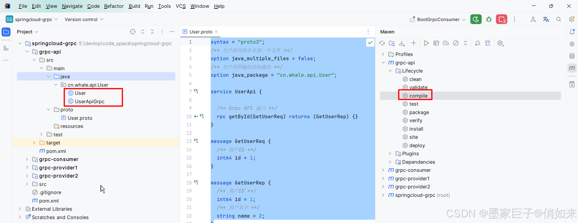 编写好proto文件后,对api模块进行compile(idea 右侧 - api模块 - lifecycle - compile) ,然后会自动在api模块中生成grpc相关的 api接口。