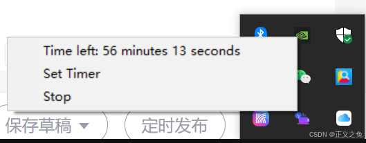 因为python的功能强大,且开发程序的门槛低,所以我选择它,我电脑安装的版本是3.10. 第一步,开发一个可以显示在底部工具栏右边隐藏托盘的图标,当我们有鼠标放上去时,可以显示当前离下一次休息还剩下的时间,以分钟和秒计。点击鼠标右键时,可以弹出菜单显示当前剩余时间和退出按钮。