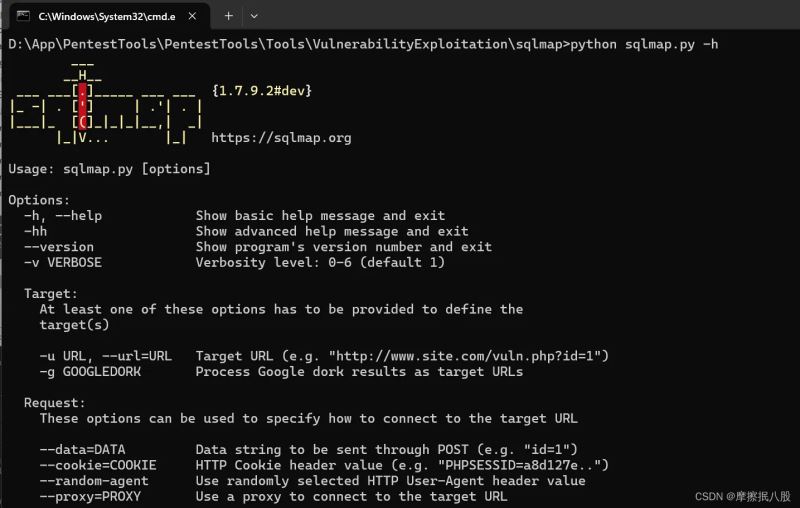 输入命令python sqlmap.py或python sqlmap.py -h检验是否成功,出现如图所示界面就代表成功了。