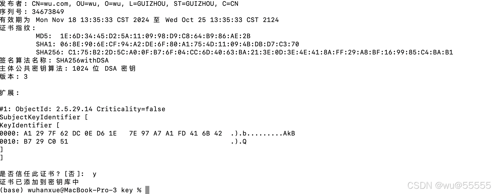 谨记这里的密码库密码storepass为“wu@2024555”,私钥密码keypass为"wu@private2024",后续还会使用到,私钥别名为“privatekey”