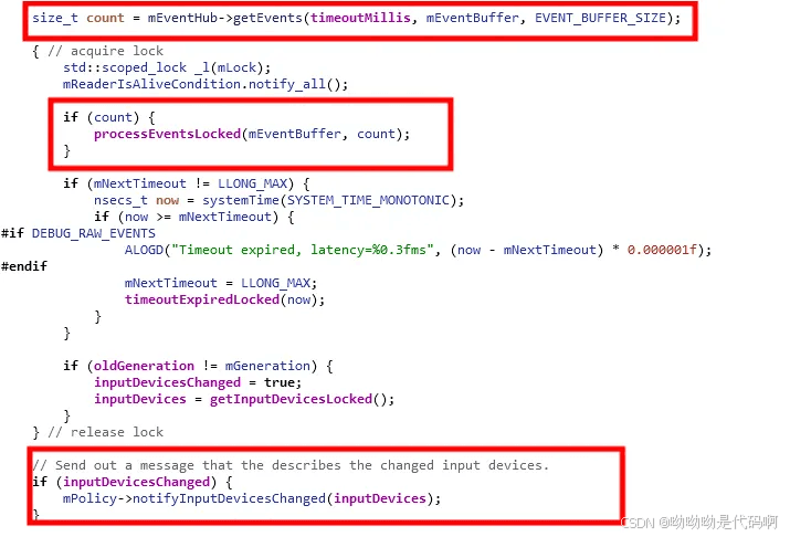 size_t count = meventhub->getevents(timeoutmillis, meventbuffer, event_buffer_size)主要是从device_path = /dev/input获取kernel的event,这里的事件不仅包含了input,也包含了输入设备的add/remove。