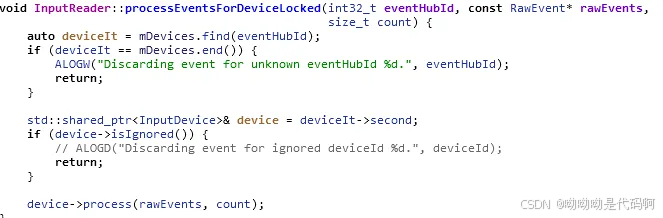 根据不同的deviceidc从mdevice中获取到对应的device,获取到device后,判断该device是否合法以及是否需要被忽略,如果不是,接下来需要调用deivce->process()进行事件处理。