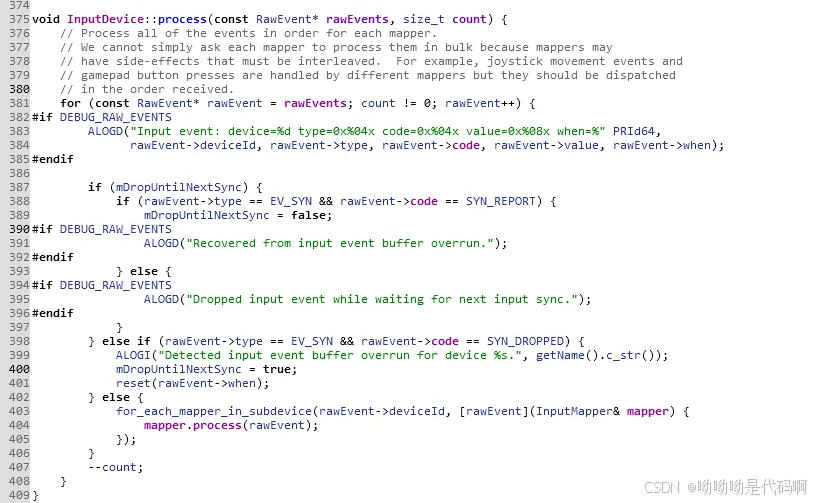 该函数中,会依次处理同一个device产生的普通输入事件,然后通过for_each_mapper_in_subdevice()进行转换调用inputmapper.process()进行事件处理。