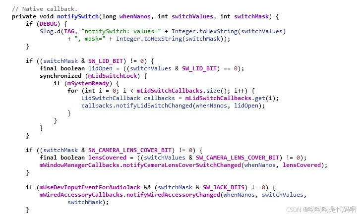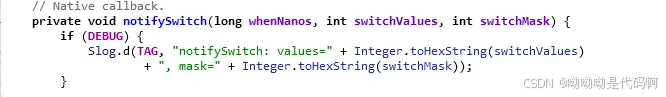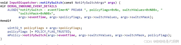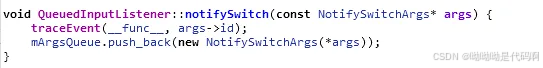 可以观察到,mlistener(listener)还是上面带下来的参数inputdispatcher::mdispatcher,也就是mclassifier→notifyswitch()最终调用的是inputdispatcher::notifyswitch()