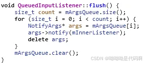 在flush()函数中,依次取出margsqueue队列中的数据,调用notifyargs args->notify(minnerlistener)进行处理。