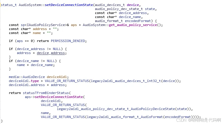 通过final int res = maudiosystem.setdeviceconnectionstate(device, audiosystem.device_state_available, address, devicename, audiosystem.audio_format_default);