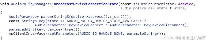 先看这个**broadcastdeviceconnectionstate(dev, state);**通过调用setparameters()通知所有的hardware module,有新的设备正在处理中: