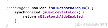 其中的misbluetootha2dpon = maudioservice.isbluetootha2dpon()获取当前bt设备的状态,会调用到audiodevicebroker.java->isbluetootha2dpon()
